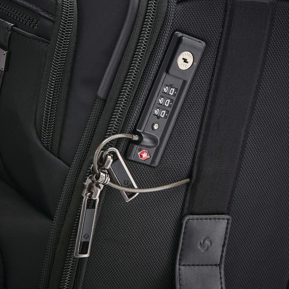 - Cable TSA Lock: TSA-approved cable lock threads through zipper pulls to secure access to the main compartment