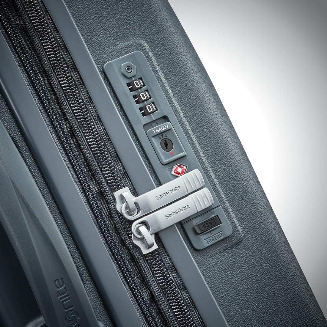 - USB port with protective cover integrates into the TSA-approved lock panel for streamlined design and charging convenience (battery not included)