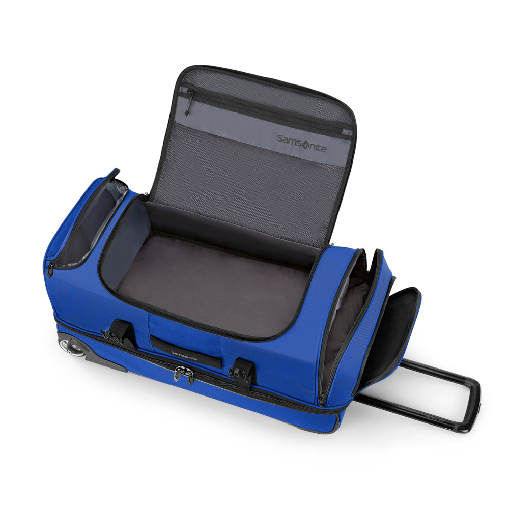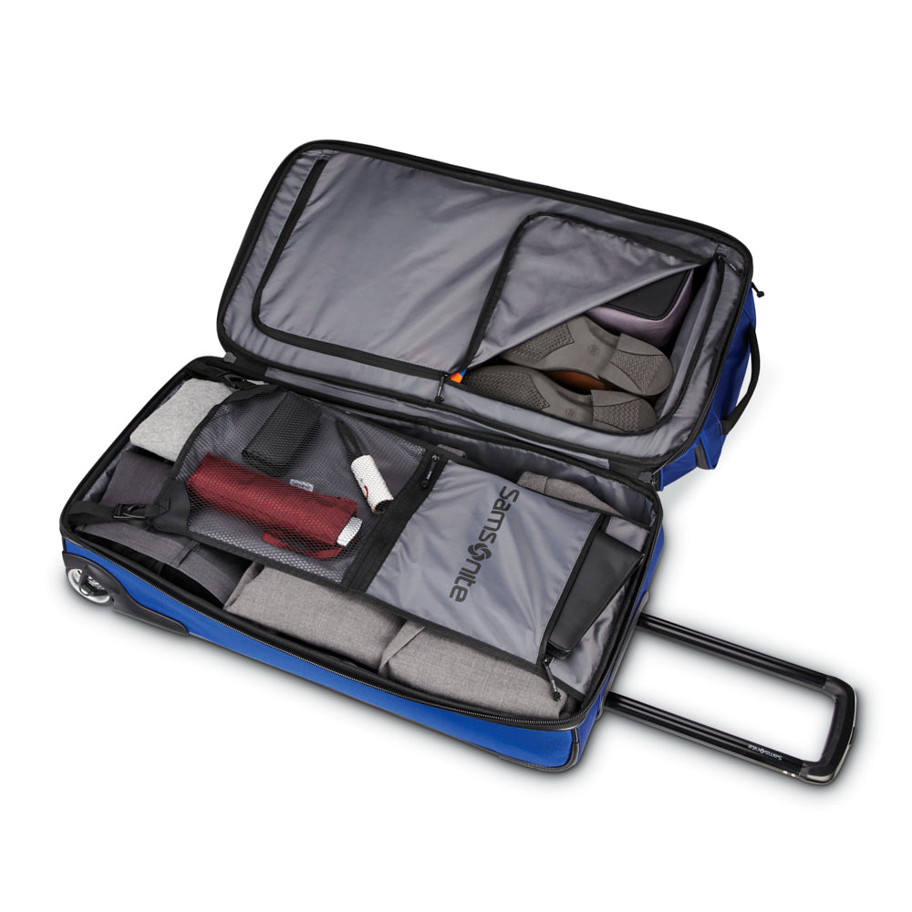 Packed with capacity, the Detour Duffel will protect your belongings on the toughest of trips. Built with long-lasting, ultra-durable water-resistant polyester, this wheeled duffel features two separate packing compartments. The structured lower half is perfect for more delicate items, while the vast upper compartment can hold loads of clothes, features a dedicated shoe pocket, as well as a separate water-resistant zippered compartment. Travelling with larger items? Simply unzip the internal divider curtain and enjoy an unobstructed full capacity layout for all your gear. Rubberized corner protectors and kick-plates protect against wear and tear.